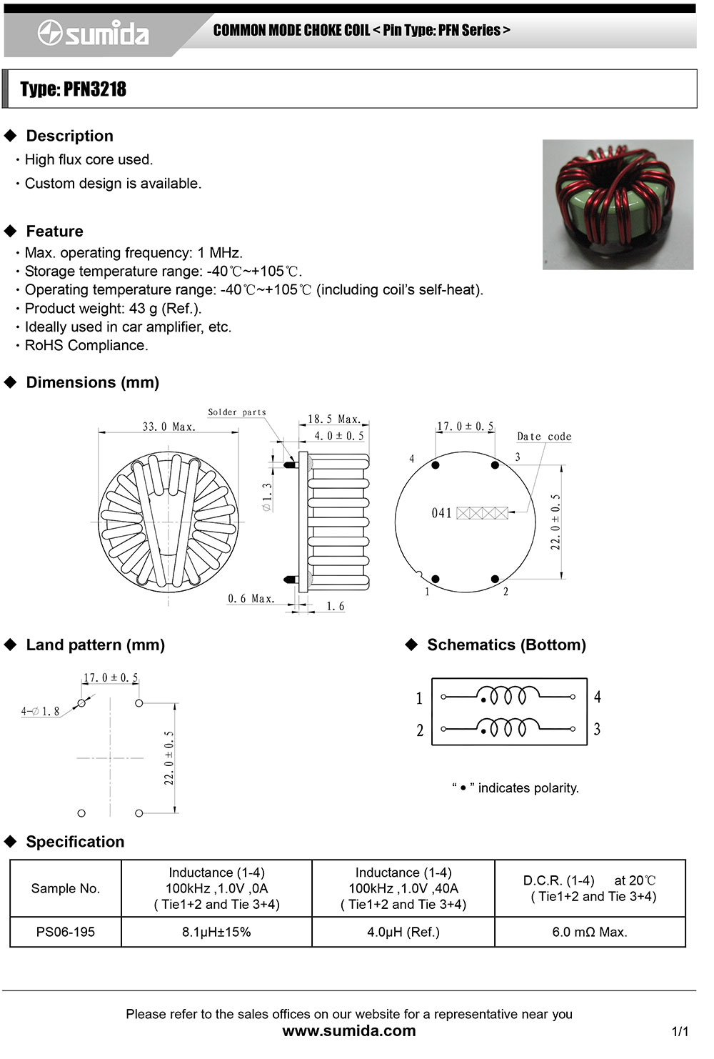 5.PFN3218有较好的直流饱和特性及吸收、消除脉冲噪声,广泛用于电路的差模噪声抑制,也可以用作于数字功放的耦合电感。