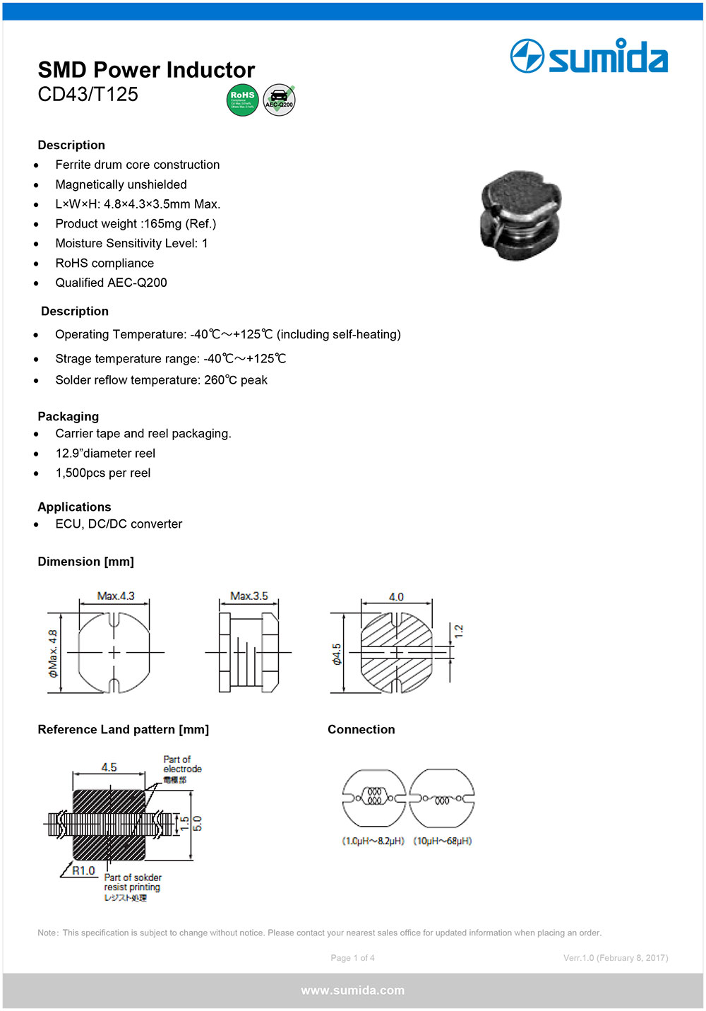 6.CD43T125广泛应用于各类车载数码产品,ECU电源控制及有车规、高温要求的DC-DC电源供电模块,