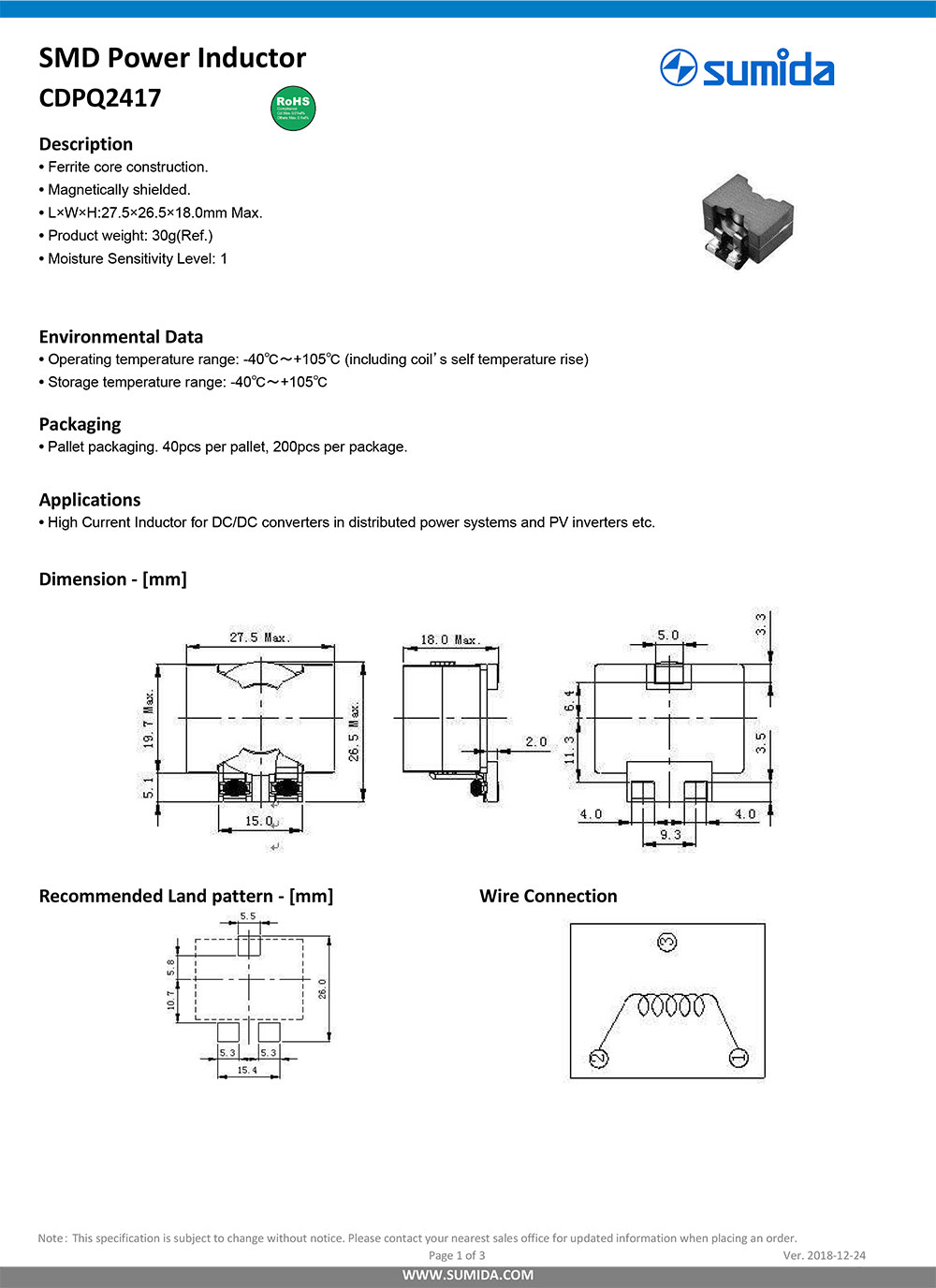 3.L*W*H--27.5*26.5*18mm 4.RoHS,最小包装300PCS