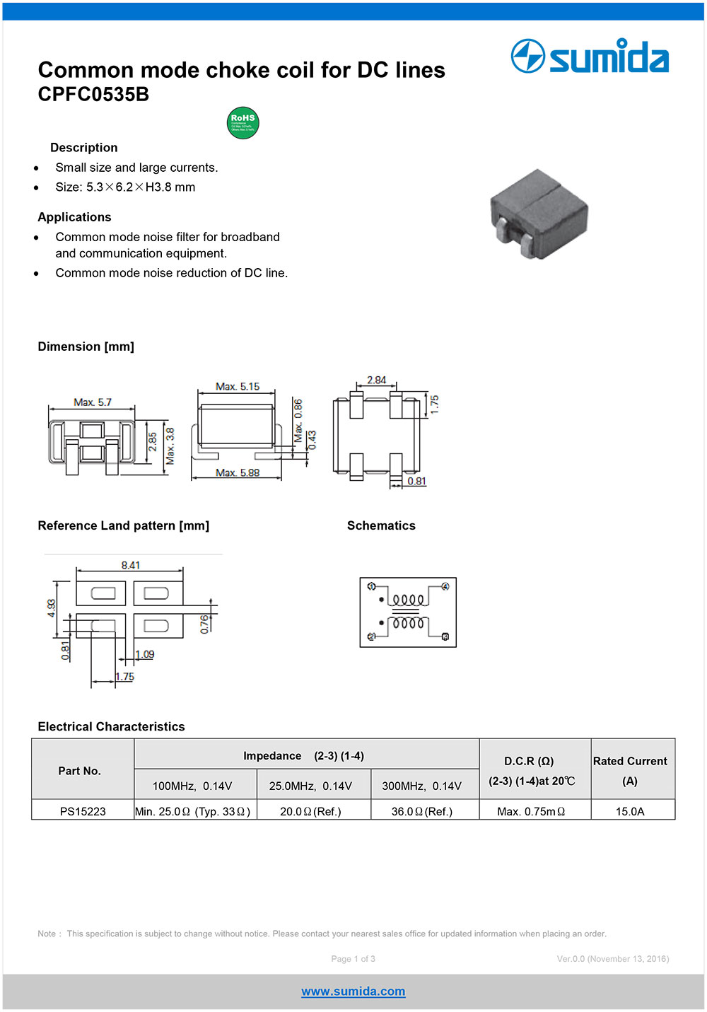 6.CPFC0535B广泛用于通讯主机CPU供电的DC电源端口共模信号抑制等,也可用于各类设备有高性耐要求的DC电源端共模信号抑制。