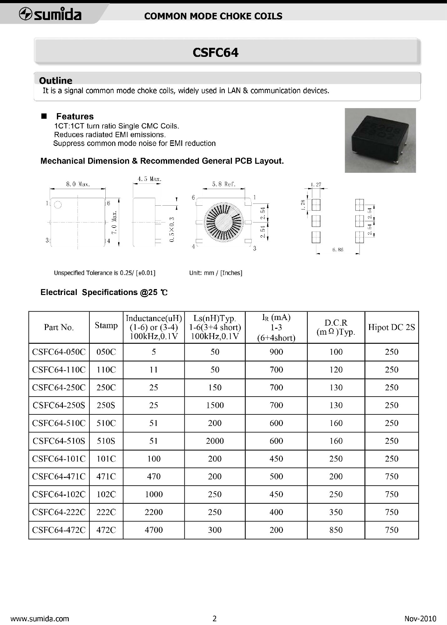 5.CSFC64广泛用于电信、通讯行业及各类工业板卡的通讯端口以及局域网的的共模信号抑制。