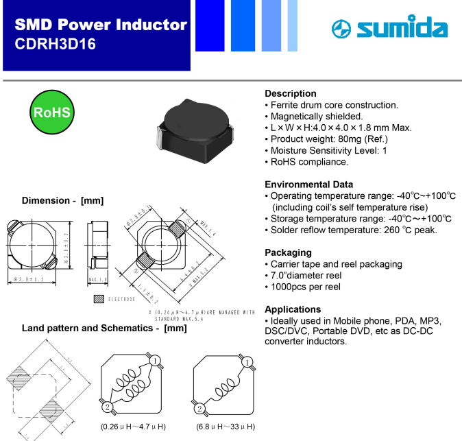 5.CDRH3D16最小包装1KPCS 12.广泛应用于手持便携电子设备及其他各类电子仪器仪表
