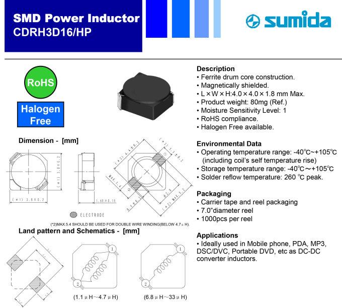 1.CDRH3D16HP磁屏蔽结构,传统构造,散热好,高功率型